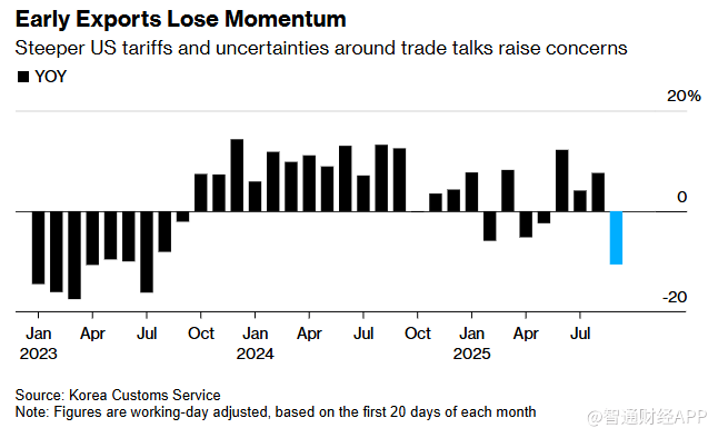 今年迄今为止,有着“全球经济金丝雀”之称的韩国出口保持坚挺,部分原因是制造商在8月份关税生效前匆忙发货。这种提前发货起到了一定的短期提振作用,但随着提振作用消退,出口越来越容易受到高关税和全球需求放缓的拖累。