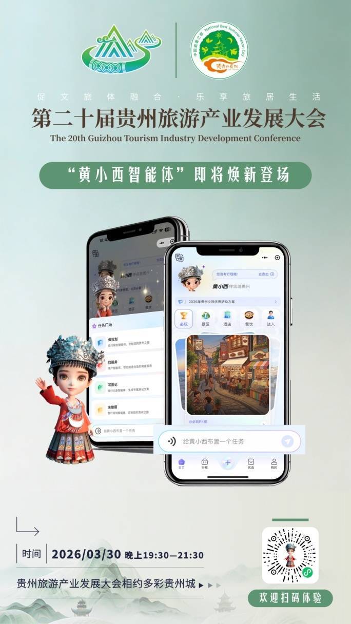 还记得去年第十九届贵州旅游产业发展大会上,那个初亮相就吸引众多关注的“黄小西”吗?一年过去了,“黄小西”不曾懈怠,潜心打磨、深度迭代,将于3月30日在第二十届贵州旅游产业发展大会上以全场景智能服务矩阵全新亮相。