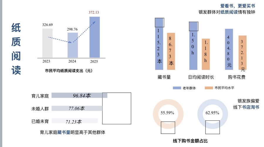上海市育儿家庭纸质阅读表现亮眼。育儿家庭纸质书储量平均为96.84本,远超未婚人群(77.06本)、已婚未育人群(71.23本)。过去一年育儿家长人均购书支出447.81元,大幅领先平均水平(372.13元)。