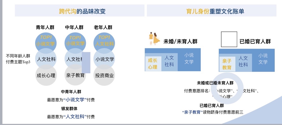 在阅读付费的主题调查上,青年与中年群体一致将“小说文学”列为首选,而银发群体则首选为“人文历史/社科科普”买单,显示其阅读重心更趋向实用性阅读。