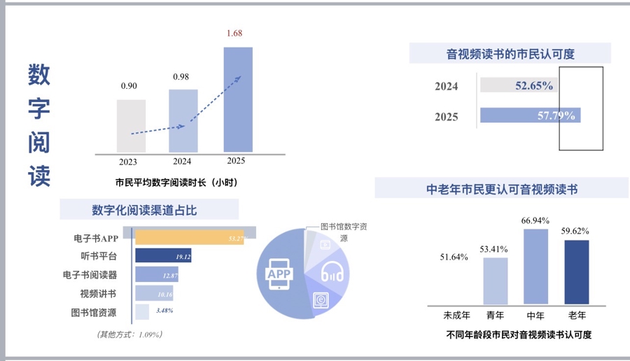 音视频读书在中老年市民中“圈粉”。音视频读书正成为数字阅读重要形式。2025年市民对其认可度达到57.79%,在2024年基础上(52.65%)进一步提升。中年群体支持度最高(66.94%),老年群体紧随其后(59.62%)。阅读媒介形态正在发生转向。