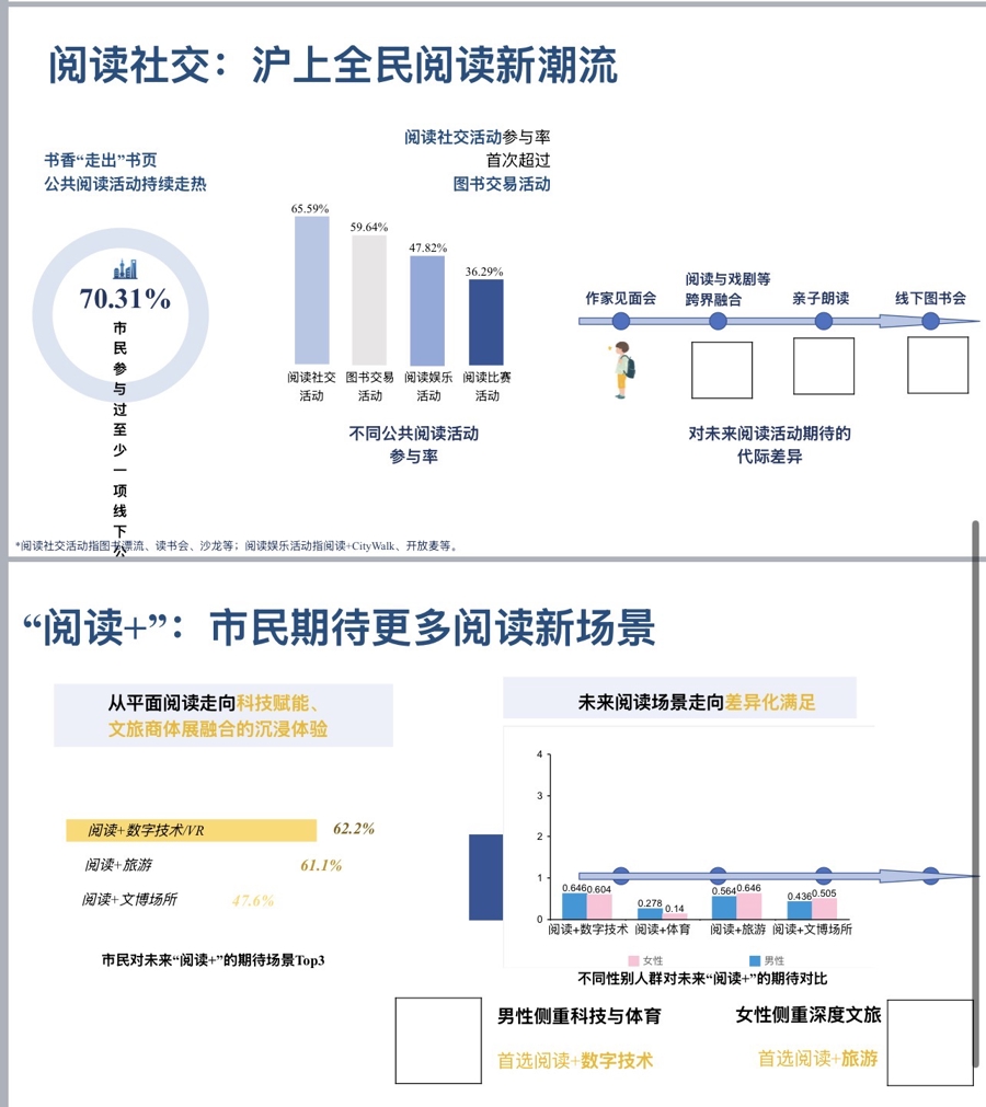 阅读社交成为上海全民阅读新潮流。过去一年,七成市民(70.31%)参与过至少一项线下公共阅读活动。其中,诸如读书分享会的阅读社交活动参与率(65.59%)首次超过图书交易活动,位居第一。书香正走出书页,阅读成为城市文化社交新入口。