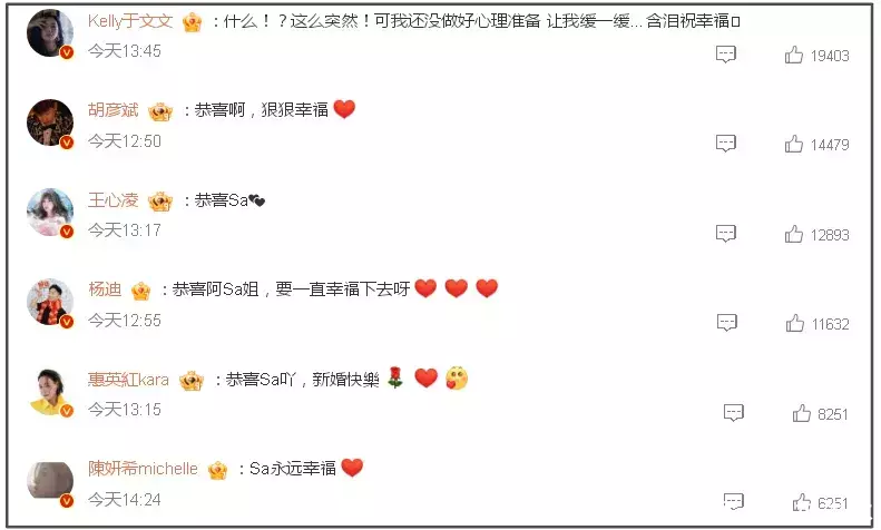 于文文、胡彦斌、王心凌、杨迪、惠英红、陈妍希、王祖蓝、黄小蕾、阿娇、许茹芸等20多位艺人在评论区送出祝福,其中于文文也表示阿Sa结婚消息来得太突然。