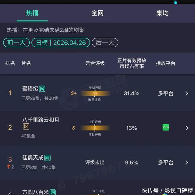 《蜜语纪》同时拿下年度第二高市占率、现阶段断层领先第一和5.4的豆瓣评分,这个撕裂程度本身就说明了很多问题。《蜜语纪》4月27日以31.4%的云合市占率断层第一领跑,单日预估播放量五千三百九十万,是同期第二名《八千里路云和月》的两倍以上。平台站内热度值突破两万八,创下单元最高纪录,东方卫视直播收视峰值破一,连续十一天蝉联九大榜单冠军,抖音主话题播放量三十七点九亿。